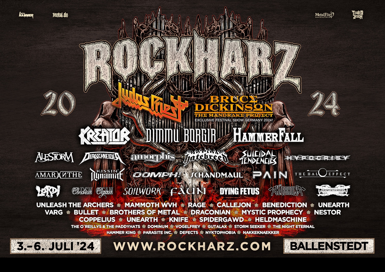 ALESTORM, AMARANTHE, AMORPHIS, AVATARIUM, BENEDICTION, BROTHERS OF METAL, BRUCE DICKINSON („THE MANDRAKE PROJECT“ Exclusive Festival Show Germany 2024), BULLET, CALLEJON, COPPELIUS, D’ARTAGNAN, DEFECTS, DIMMU BORGIR, DIRKSCHNEIDER, DOMINUM, DRACONIAN, DYING FETUS, DYNAZTY, FAUN, GUTALAX, HAMMERFALL, HAMMERKING, HATEBREED, HELDMASCHINE, HYPOCRISY, JUDAS PRIEST, KÄRBHOLZ, KANONENFIEBER, KISSIN' DYNAMITE, KNIFE, KREATOR, LEAGUE OF DISTORTION, LORDI, MAMMOTH WVH, MASSIVE WAGONS, MYSTIC PROPHECY, NAKKEKNAEKKER, NANOWAR OF STEEL, NESTOR, NYKTOPHOBIA, OOMPH!, ORDEN OGAN, PAIN, PARASITE INC., POWER PALADIN, RAGE, SCHANDMAUL, SOILWORK, SPIDERGAWD, STORMSEEKER, SUICIDAL TENDENCIES, THE HALO EFFECT, THE NIGHT ETERNAL, THE O'REILLYS AND THE PADDYHATS, UNEARTH, UNLEASH THE ARCHERS, VAN CANTO, VARG, VOGELFREY.